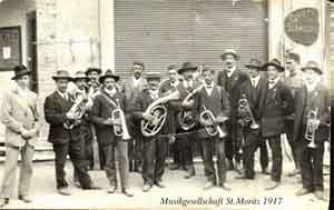 Nach den Dorfbränden in Susch (1869) und Zernez (1872) taten sich die Männer von St. Moritz zusammen und gründeten eine Selbsthilfe, die Feuerwehr, an der Spitze Johann Josty als Obmann, ausgerüstet mit einer Wasserkübel- und einer Schlagtuchmannschaft sowie Feuerwehrhornbläsern. Anscheinend war es auch zu jener Zeit - wie noch heute - Usus, nach den Übungen noch am Stammtisch das gesellige Zusammensein zu pflegen, und nach ein paar Gläschen Wein wurden oft einige Lieder angestimmt. An einem solchen Abend entstand die Idee, diesen Gesang etwas zu kultivieren, und also den Männerchor "Frohsinn" zu gründen. Wenig später - der Obmann hatte mit den Hornbläsern die Handhabung der Hörner geübt - tauchte die Idee einer Blechmusik auf, was zur Gründung der "Feuerwehrmusik" führte. So entstanden denn im gleichen Jahr, nämlich 1876, diese beiden Vereine, durch all die Jahre mit kameradschaftlichen Banden verknüpft.
